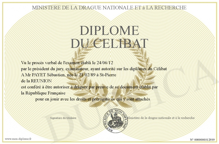 Envoyez par email votre Diplôme du Célibat personalisé