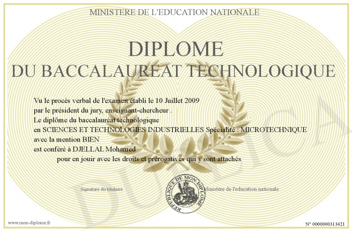 Envoyez par email votre Diplôme du baccalauréat technologique personalisé