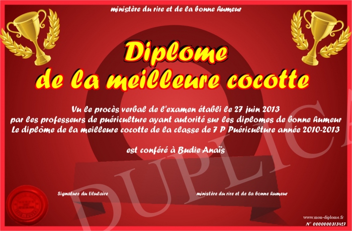 Envoyez par email votre Diplome de la meilleure cocotte personalisé
