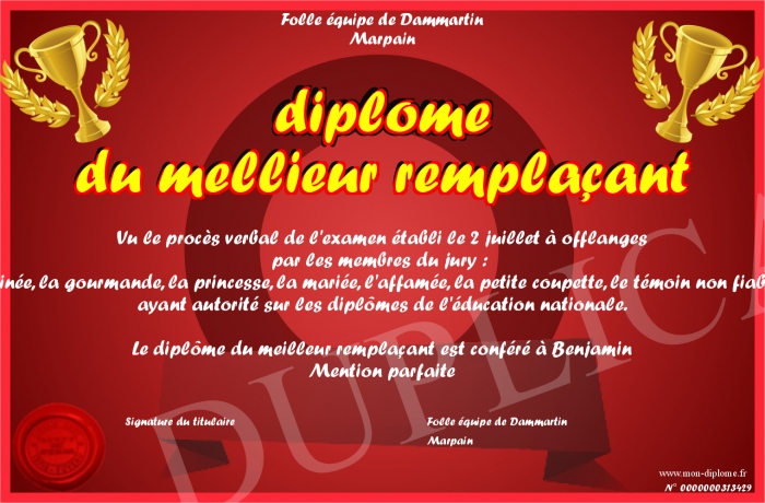 Envoyez par email votre diplôme du mellieur remplaçant personalisé