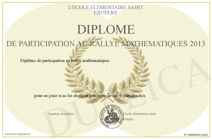 Envoyez par email votre Diplôme de participation au rallye mathématiques 2013 personalisé