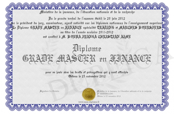 Envoyez par email votre Diplôme GRADE MASTER en FINANCE personalisé