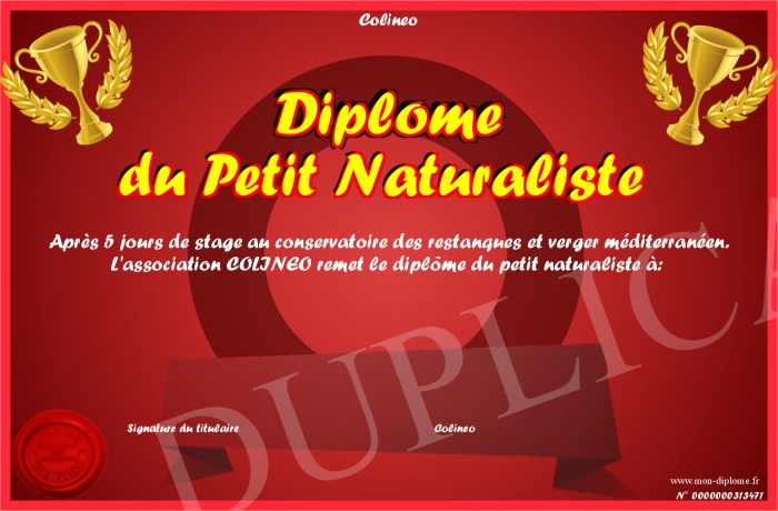 Envoyez par email votre Diplôme du Petit Naturaliste personalisé