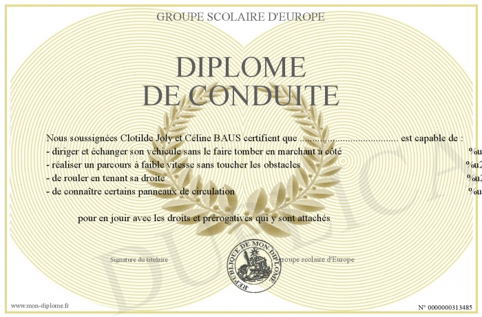 Envoyez par email votre diplôme de Conduite personalisé