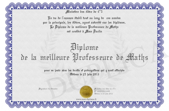 Envoyez par email votre Diplome de la meilleure Professeure de Maths personalisé
