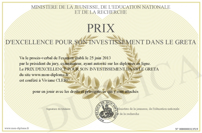 Envoyez par email votre PRIX D'EXCELLENCE POUR SON INVESTISSEMENT DANS LE GRETA personalisé