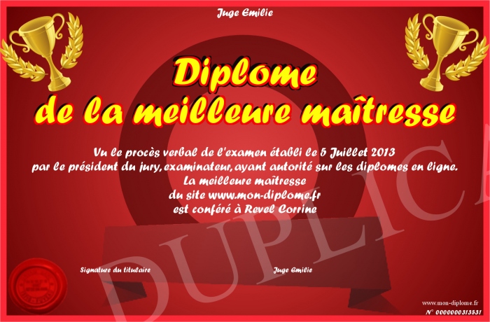 Envoyez par email votre Diplôme de la meilleure maîtresse personalisé