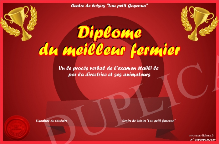 Envoyez par email votre Diplôme du meilleur fermier personalisé