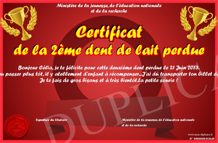 Envoyez par email votre Certificat de la 2ème dent de lait perdue personalisé