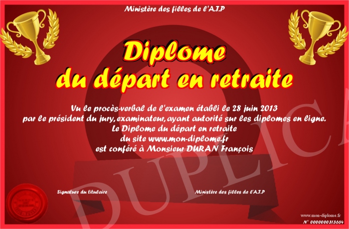 Envoyez par email votre Diplôme du départ en retraite personalisé