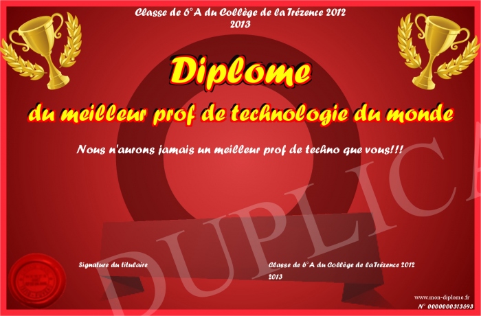 Envoyez par email votre Diplôme du meilleur prof de technologie du monde personalisé