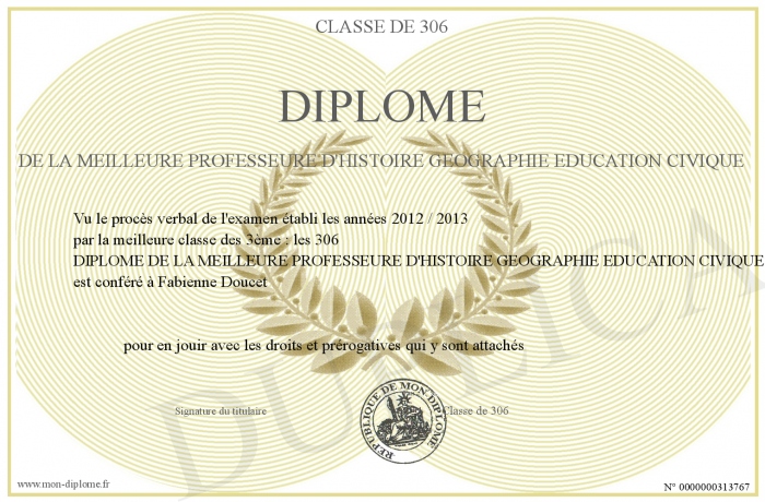 Envoyez par email votre Diplôme de la meilleure professeure d'histoire géographie éducation civique personalisé