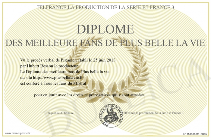 Envoyez par email votre Diplôme des meilleure fans de Plus belle la vie personalisé