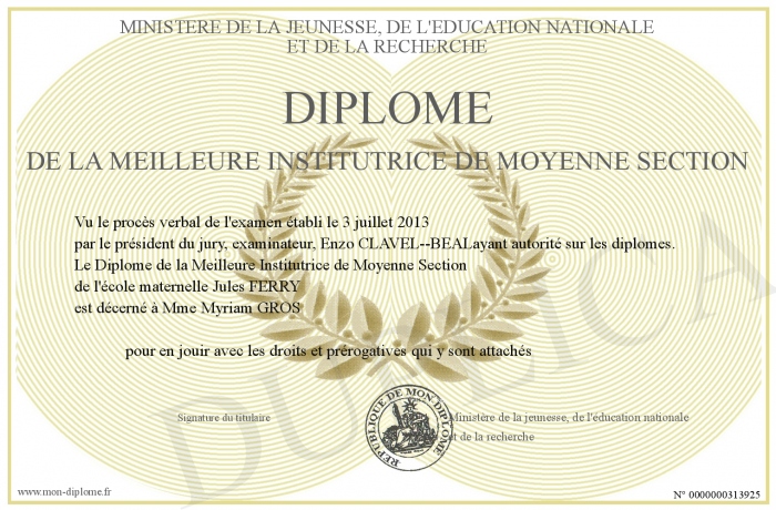 Envoyez par email votre Diplôme de la Meilleure Institutrice de Moyenne Section personalisé