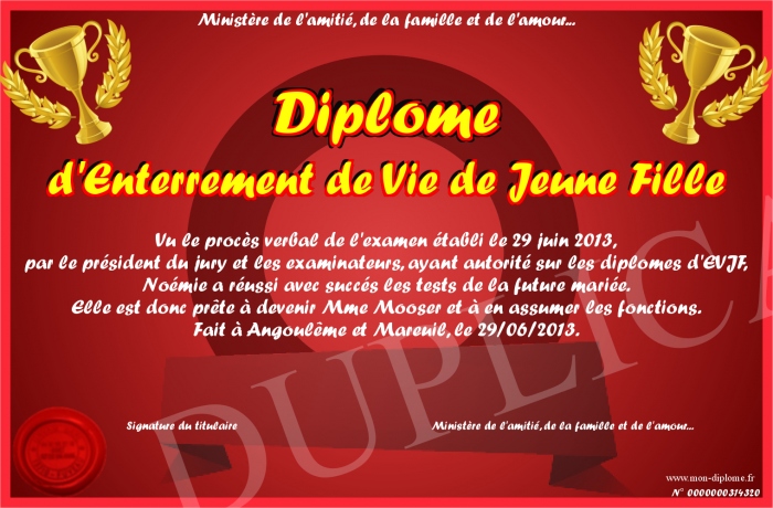 Envoyez par email votre Diplôme d'Enterrement de Vie de Jeune Fille personalisé