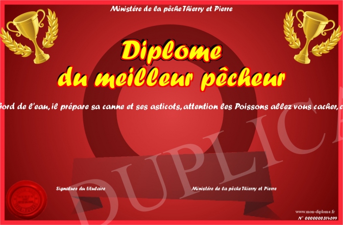 Envoyez par email votre Diplôme du meilleur pêcheur personalisé