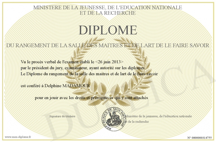 Envoyez par email votre Diplôme du rangement de la salle des maitres et de lart de le faire savoir personalisé
