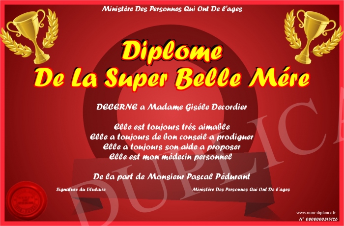 Envoyez par email votre Diplôme De La Super Belle Mére personalisé