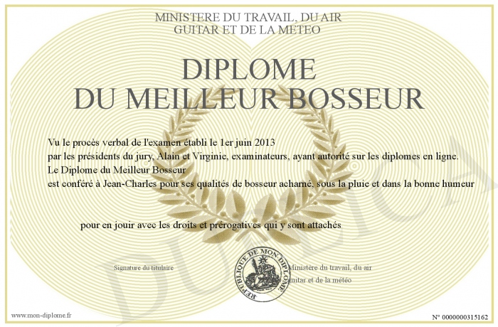 Envoyez par email votre Diplôme du Meilleur Bosseur personalisé
