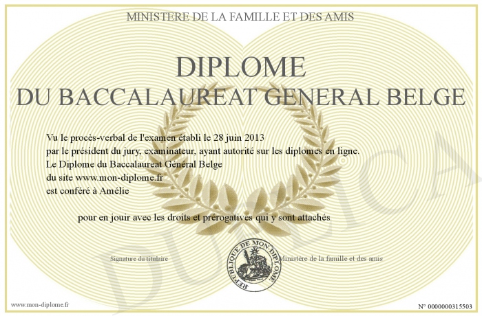 Envoyez par email votre Diplôme du Baccalaureat Général Belge personalisé