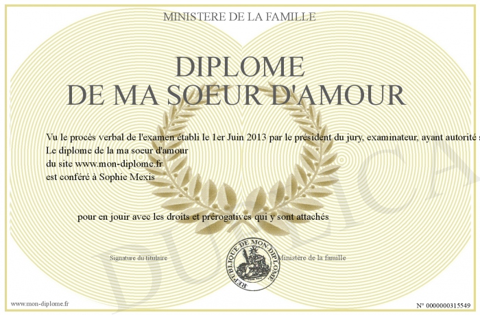 Envoyez par email votre Diplôme de Ma soeur d'amour personalisé