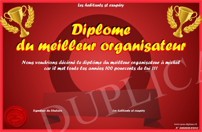 Envoyez par email votre Diplôme du meilleur organisateur personalisé