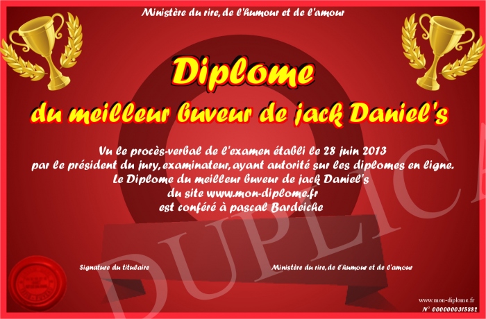 Envoyez par email votre Diplome du meilleur buveur de jack Daniel's personalisé