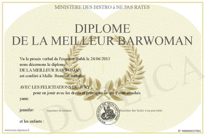 Envoyez par email votre Diplome de la meilleur barwoman personalisé