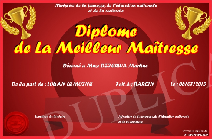 Envoyez par email votre Diplôme de La Meilleur Maîtresse personalisé