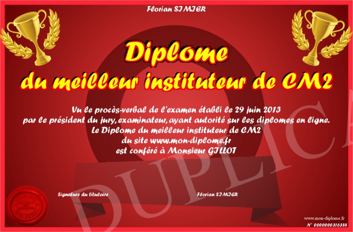 Envoyez par email votre Diplôme du meilleur instituteur de CM2 personalisé