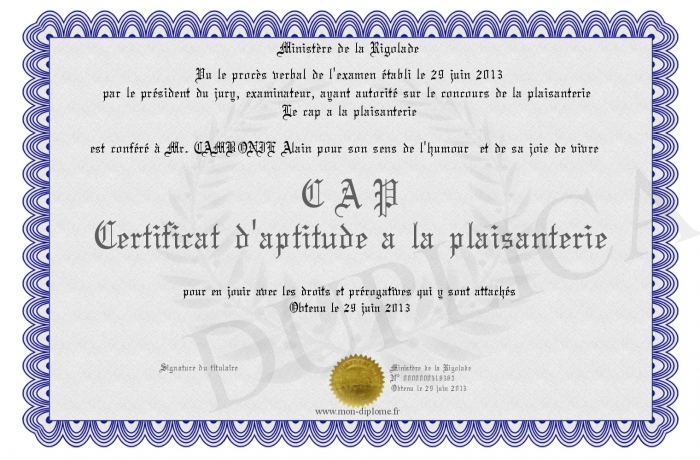 Envoyez par email votre C A P Certificat d'aptitude a la plaisanterie personalisé