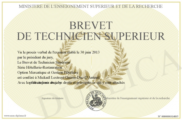 Envoyez par email votre Brevet de Technicien Supérieur personalisé