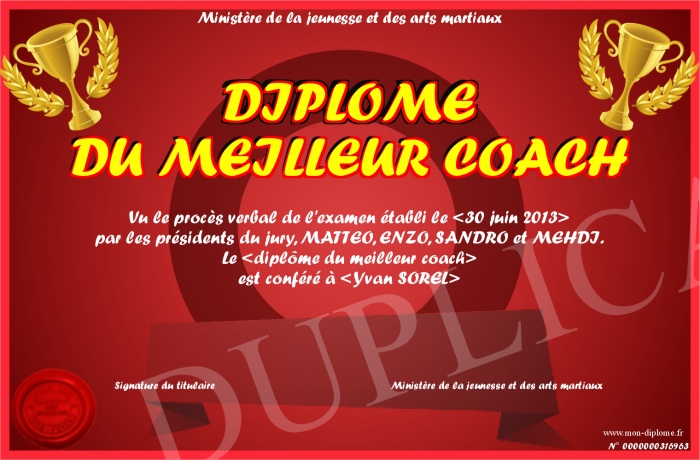 Envoyez par email votre DIPLOME DU MEILLEUR COACH personalisé