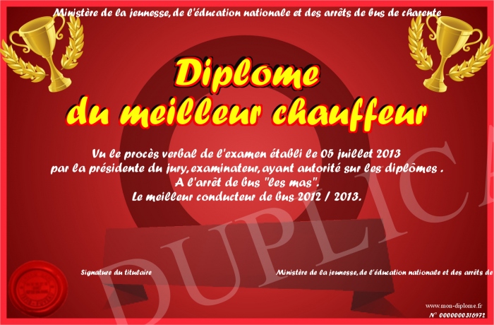 Envoyez par email votre Diplôme du meilleur chauffeur personalisé