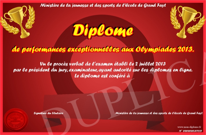 Envoyez par email votre Diplôme de performances exceptionnelles aux Olympiades 2013. personalisé