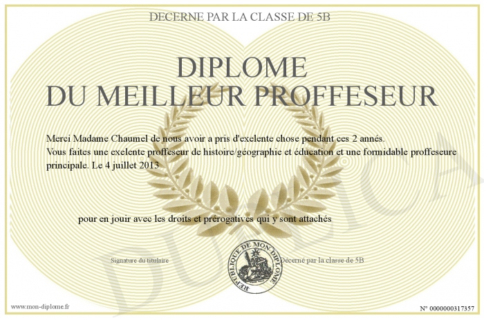 Envoyez par email votre Diplôme du meilleur proffeseur personalisé