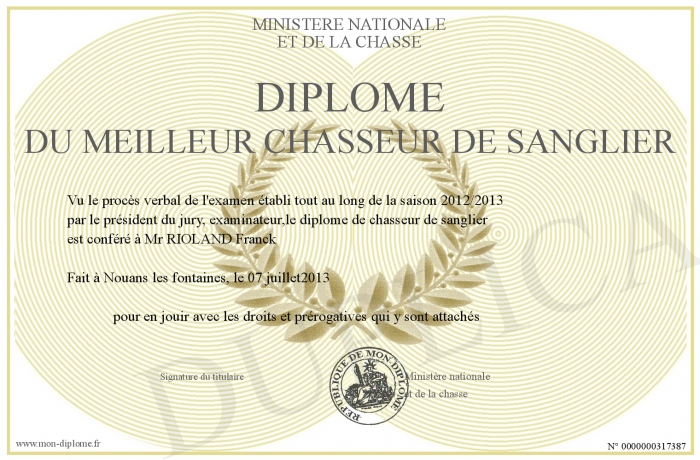 Envoyez par email votre Diplôme du meilleur chasseur de sanglier personalisé