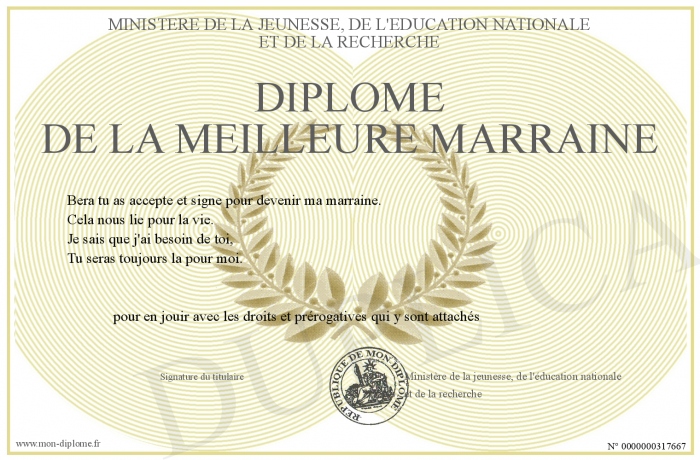 Envoyez par email votre Diplôme de la meilleure Marraine personalisé