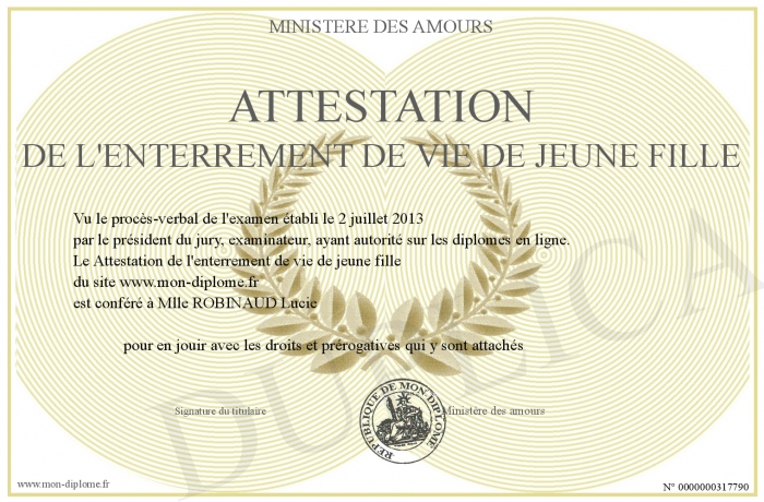 Envoyez par email votre Attestation de l'enterrement de vie de jeune fille personalisé