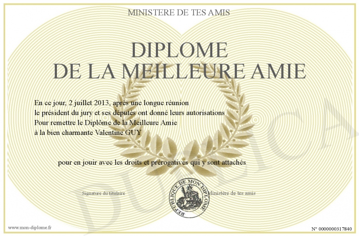 Envoyez par email votre Diplôme de la Meilleure Amie personalisé