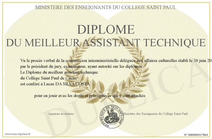 Envoyez par email votre Diplôme du meilleur assistant technique personalisé