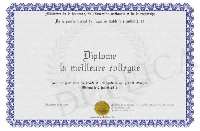 Envoyez par email votre Diplôme la meilleure collegue personalisé