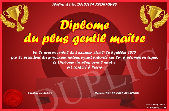 Envoyez par email votre Diplôme du plus gentil maître personalisé