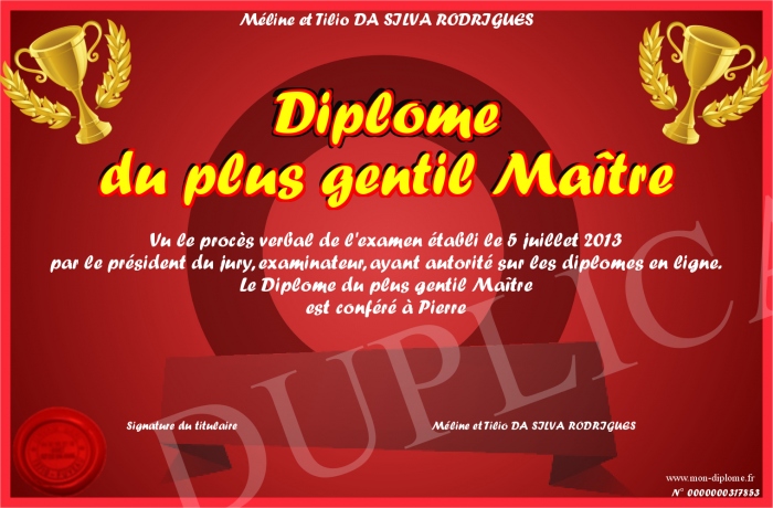 Envoyez par email votre Diplôme du plus gentil Maître personalisé