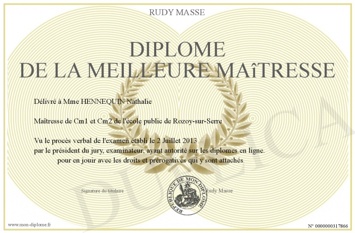 Envoyez par email votre Diplôme de la meilleure maîtresse personalisé