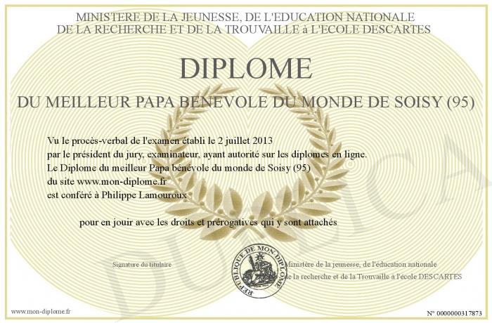 Envoyez par email votre Diplôme du meilleur Papa bénévole du monde de Soisy (95) personalisé