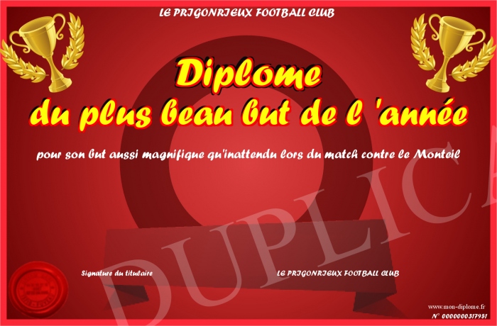 Envoyez par email votre Diplôme du plus beau but de l 'année personalisé
