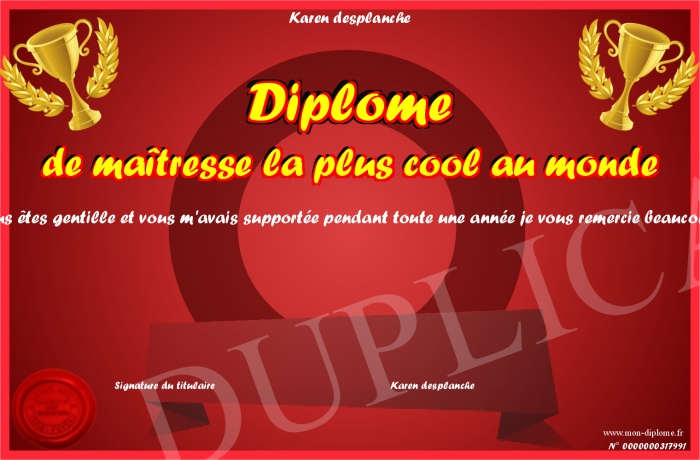 Envoyez par email votre Diplôme de maîtresse la plus cool au monde personalisé