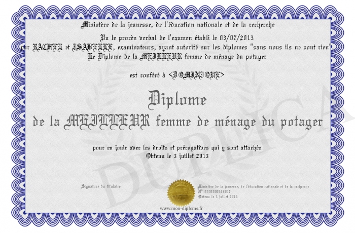 Envoyez par email votre Diplôme de la MEILLEUR femme de ménage du potager personalisé