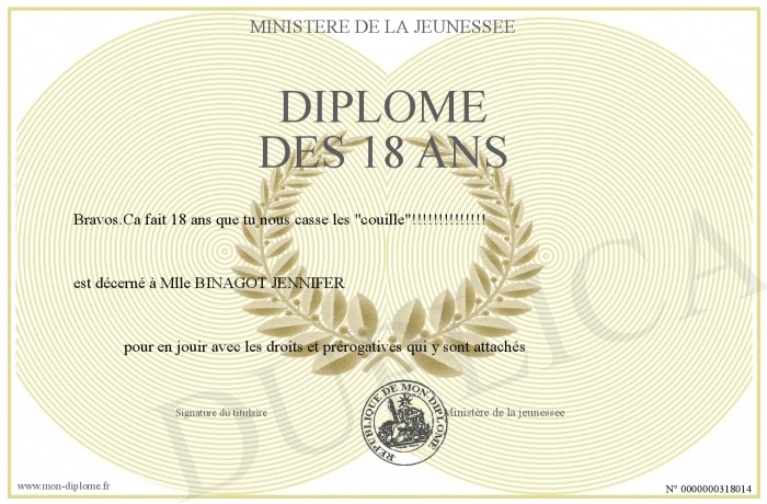 Envoyez par email votre Diplôme des 18 ans personalisé